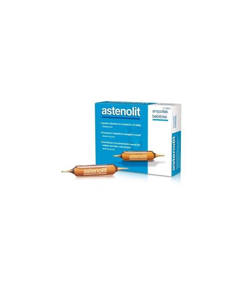 OTC Astenolit ampollas bebibles es un complemento alimenticio a base de ácido aspártico, aminoácidos y vitaminas B1, B6 y B12 que contribuyen a disminuir el cansancio y la fatiga, favorecen el metabolismo energético normal y contribuyen a equilibrar el funcionamiento normal del sistema nervioso e inmunitario.