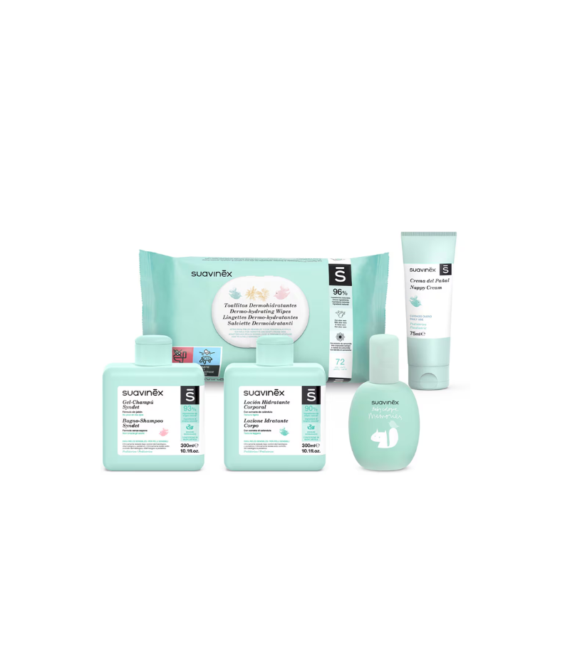 Contiene Toallitas Dermohidratantes 72uds, gel-champú 300ml, loción hidratante 300ml, colonia memories 100ml y pomada de pañal 75ml.