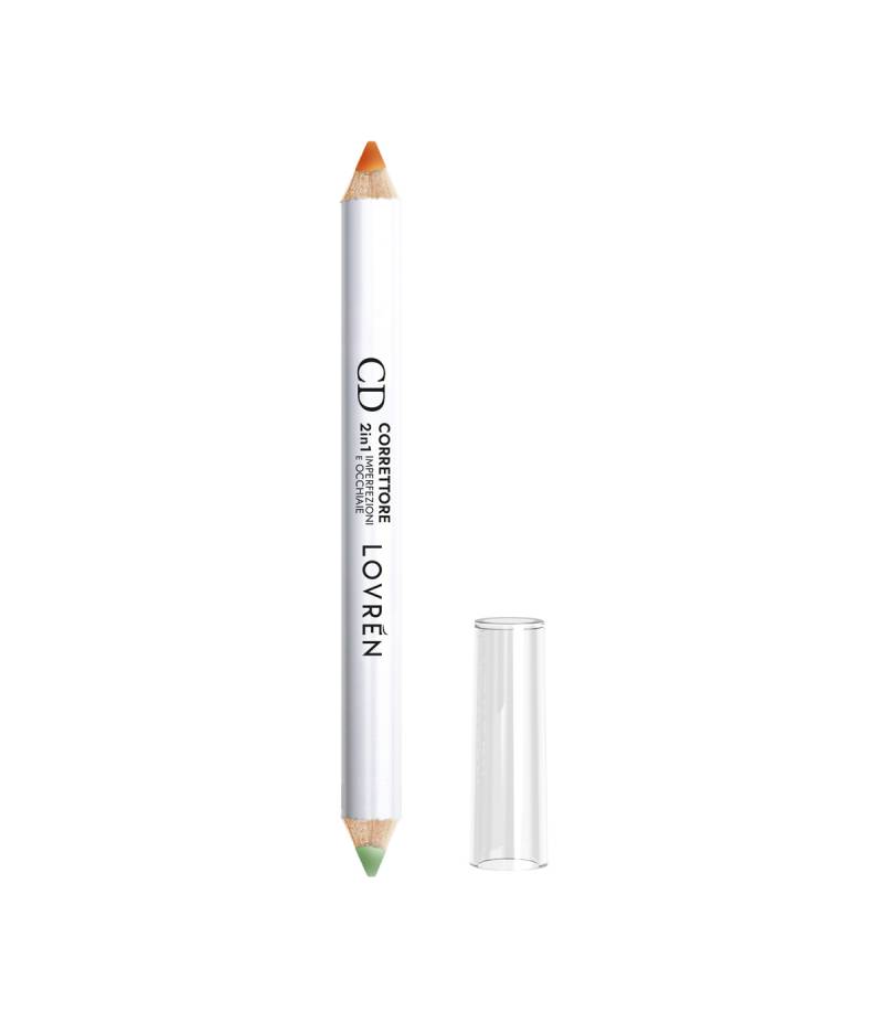 Lápiz corrector 2 en 1 que ayuda a corregir imperfecciones, rojeces y ojeras, con dos tonos específicos para neutralizar y equilibrar el color de la piel.