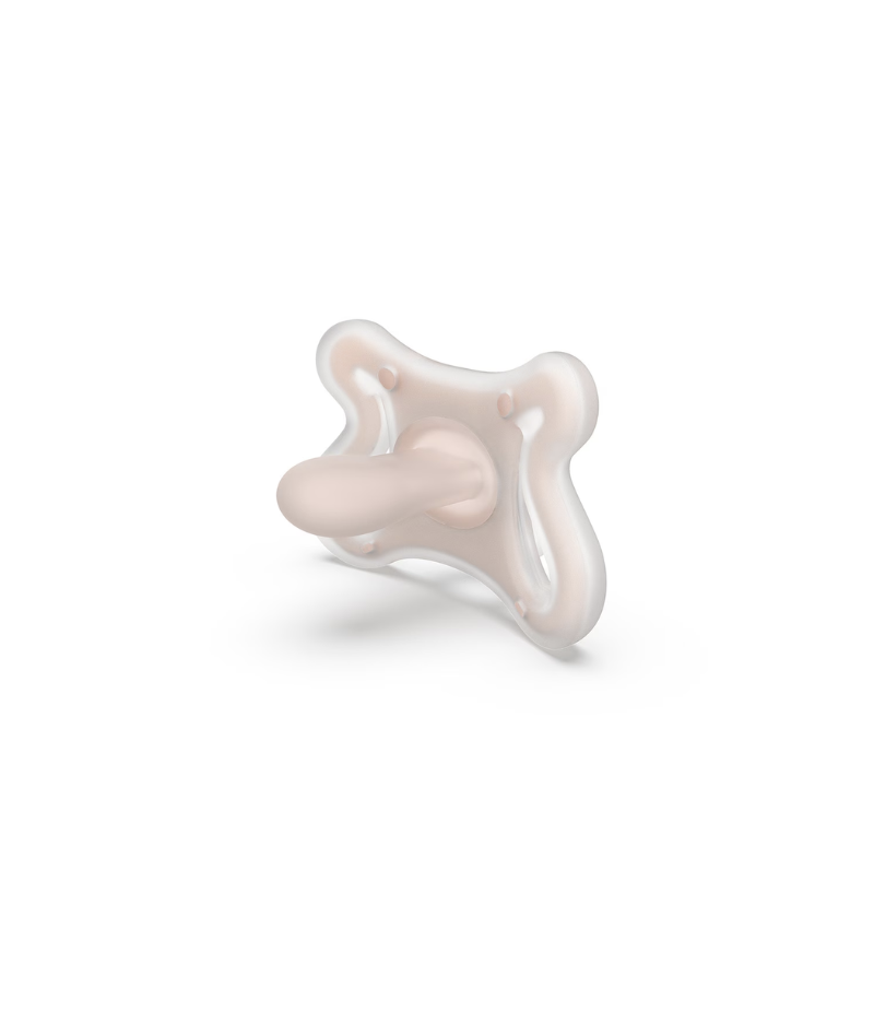 Chupete con tetina fisiológica SX Pro, respeta la posición natural de la lengua durante la succión, gracias a su cuello fino y a su cabeza plana ayuda a respetar el desarrollo bucodental.