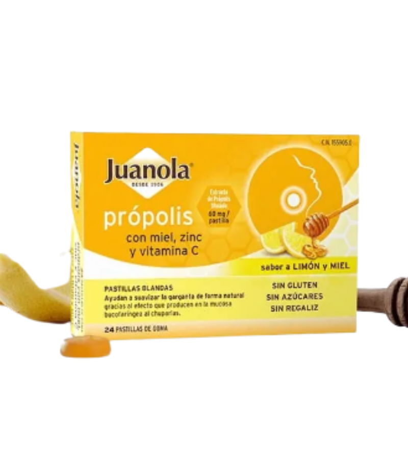 Juanola própolis + hedera con miel, zinc y vitamina C son unas pastillas blandas que combinan el efecto del extracto de própolis (60 mg/pastilla), la miel (10 mg/pastilla), el zinc (0,8 mg/pastilla) y la vitamina C (6 mg/pastilla), para suavizar la garganta gracias al efecto que producen las pastillas en la mucosa bucofaríngea al chuparlas.