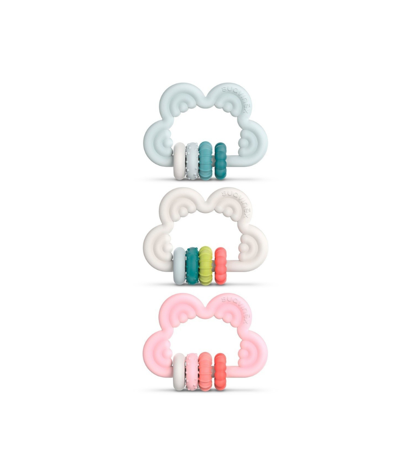 Mordedor didáctico de silicona en forma de nube. Los distintos relieves fortalecen los nuevos dientes; y las coloridas anillas estimulan sus sentidos.
