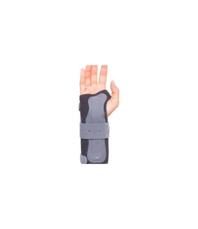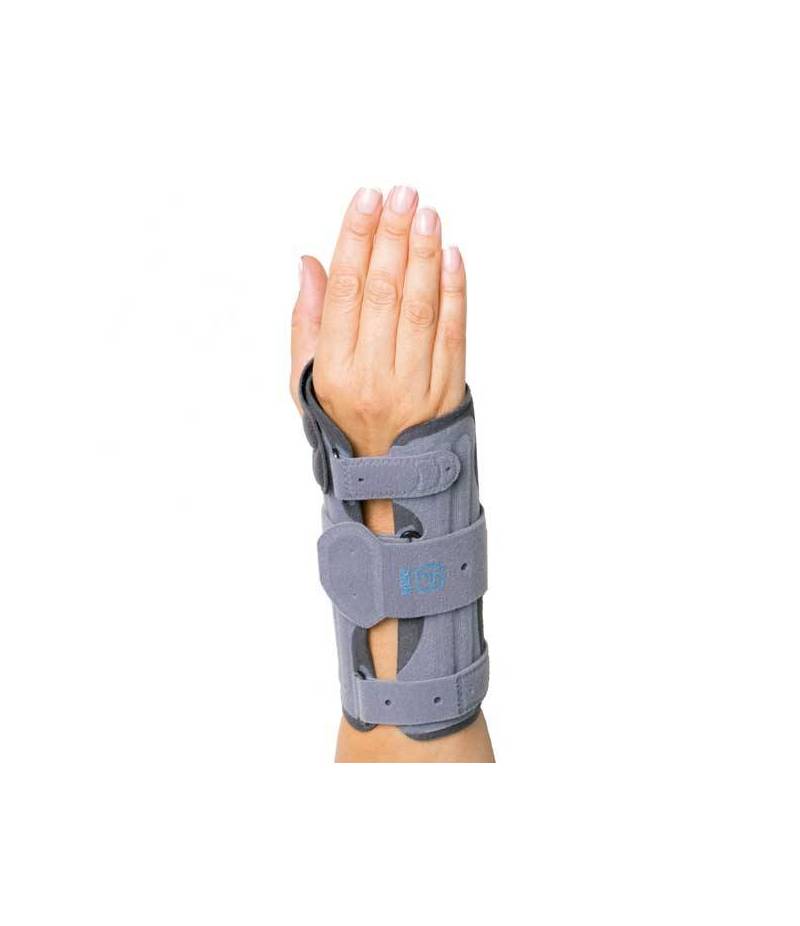 Muñequera izquierda larga que limita la flexión dorso-palmar ayudando a la desinflamación del nervio mediano, gracias a su férula maleable.