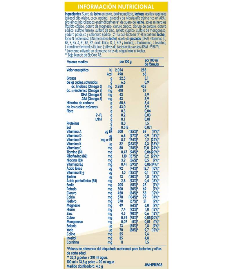 Contiene una combinación única de ingredientes: 2 HMOs (2’-FL y LNnT), Gentle OPTIPRO®, L.reuteri, DHA y otros nutrientes esenciales que ayudan a proporcionarle unas bases sólidas para su salud futura.