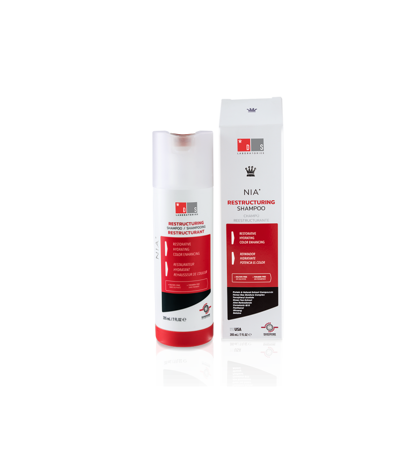 Nia Champú reestructurante con un complejo hidratante para cabellos dañados o tratados. Su fórmula con oligopéptidos, antioxidantes y nanosomas aporta suavidad, brillo y volumen al cabello sano. Indicado en cabellos expuestos al sol, tintes, secadores y planchas.