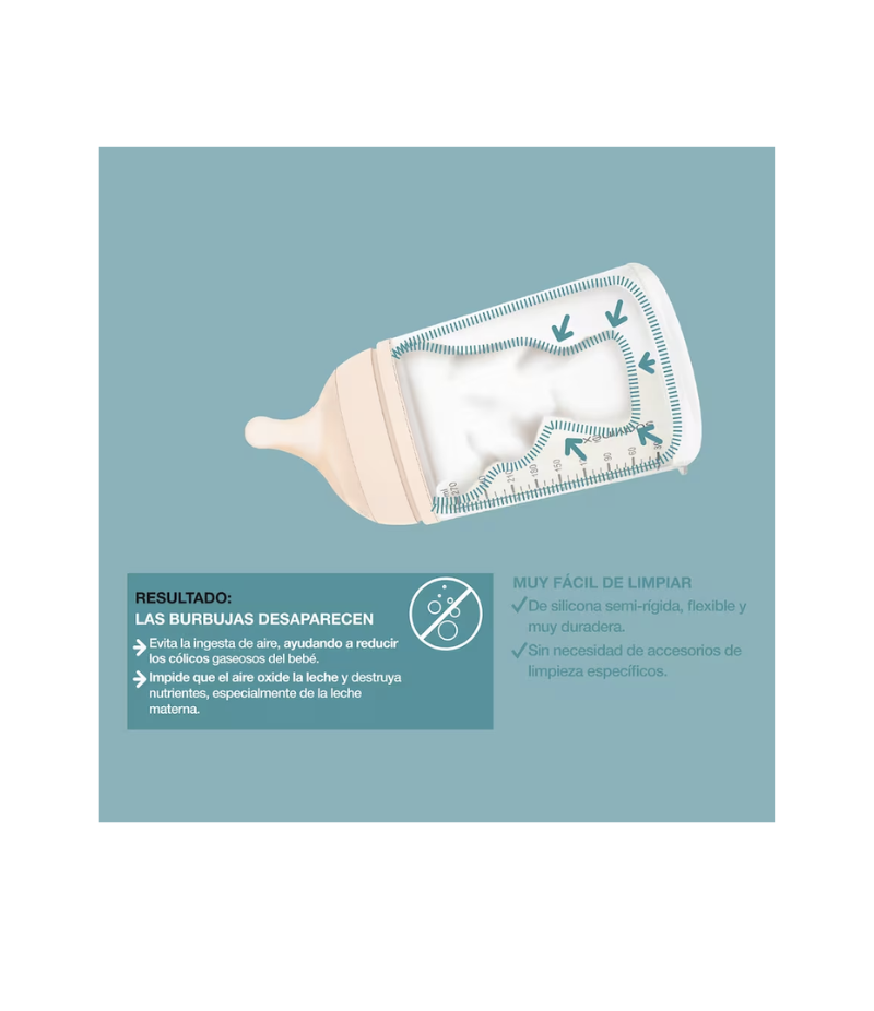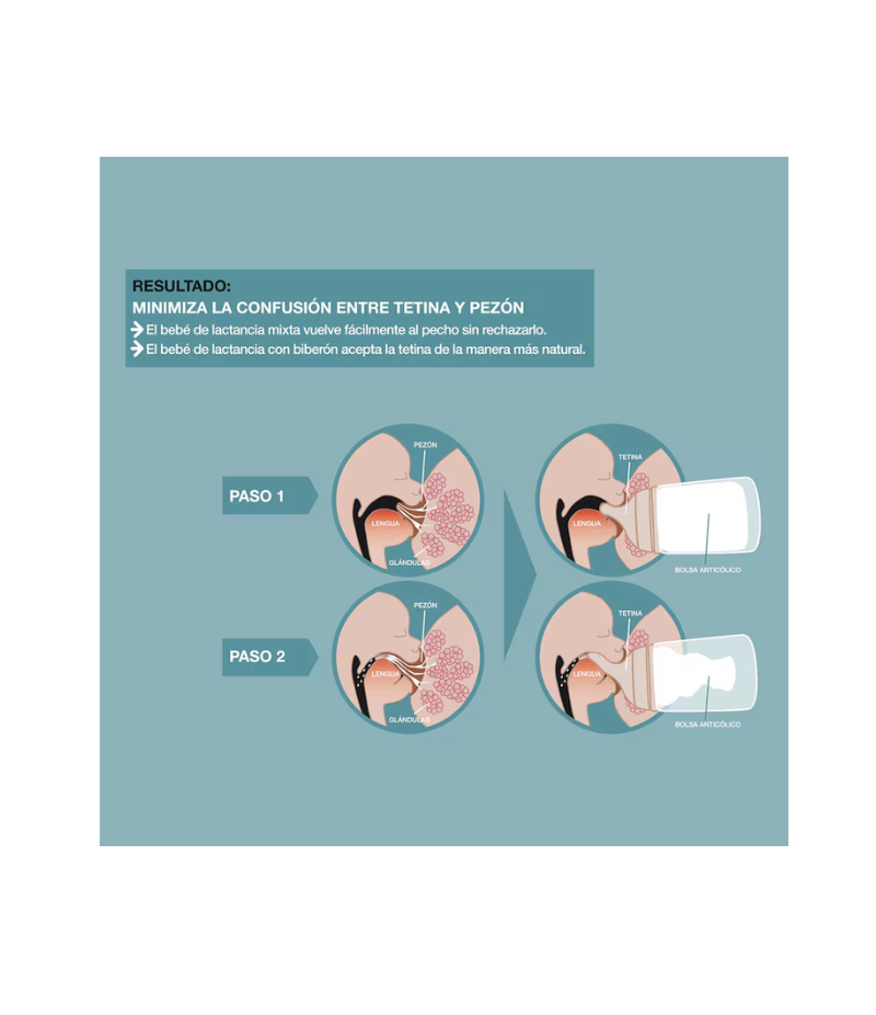 - Bolsa Anticólico: fruto de la simple observación de la naturaleza, la bolsa anticólico patentada se va contrayendo según el bebé va succionando de la misma manera que lo hacen las glándulas mamarias. La bolsa no necesita de aire exterior para compensar el vacío que se produce dentro, por lo que las burbujas desaparecen.