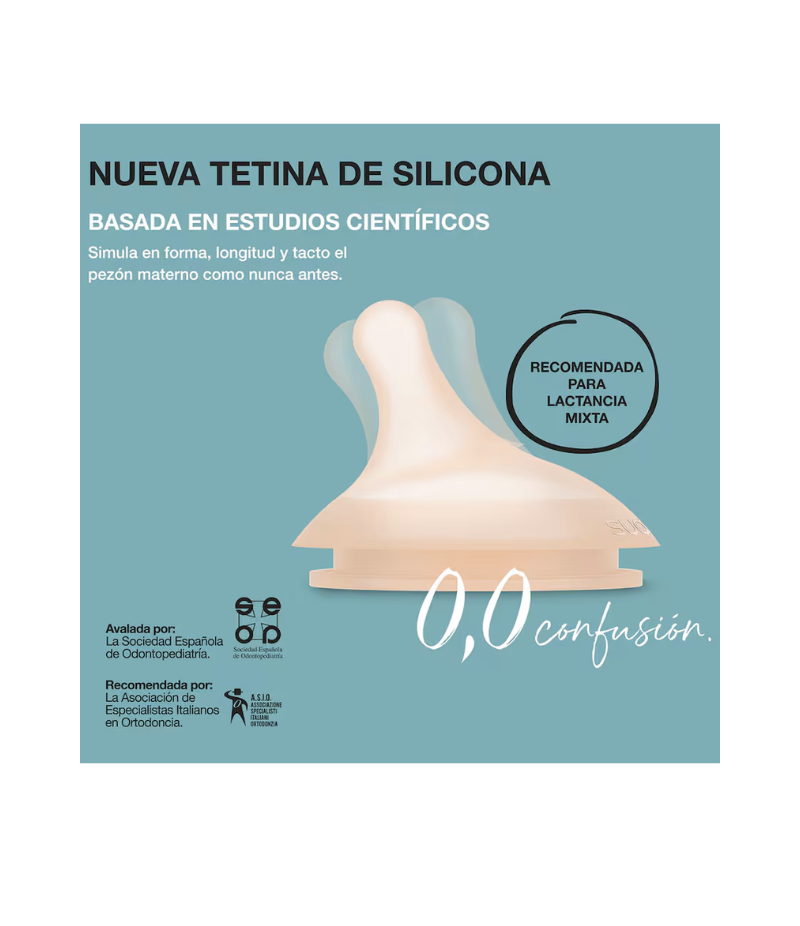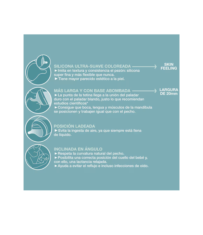 - Tetina: su diseño basado en estudios científicos recrea condiciones similares al amamantamiento natural en cuanto a agarre, esfuerzo y succión.